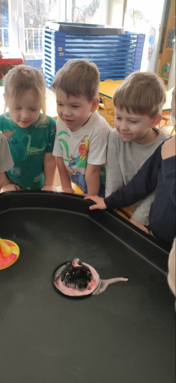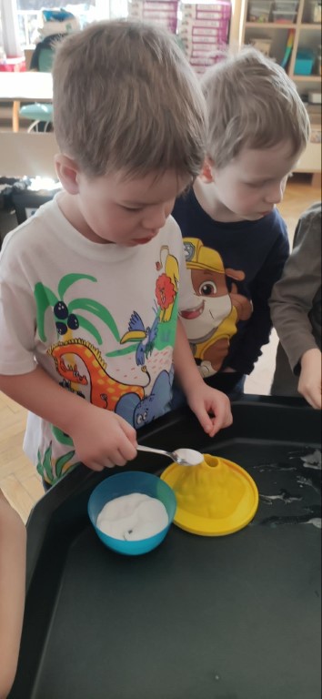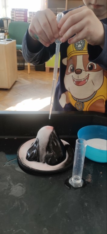 Na zakończenie tygodnia dzieci obejrzały film o wulkanach, a następnie stworzyły własne modele i przeprowadziły efektowne eksperymenty z „wybuchem” wulkanu. Było to fascynujące podsumowanie naszych dinozaurowych przygód.