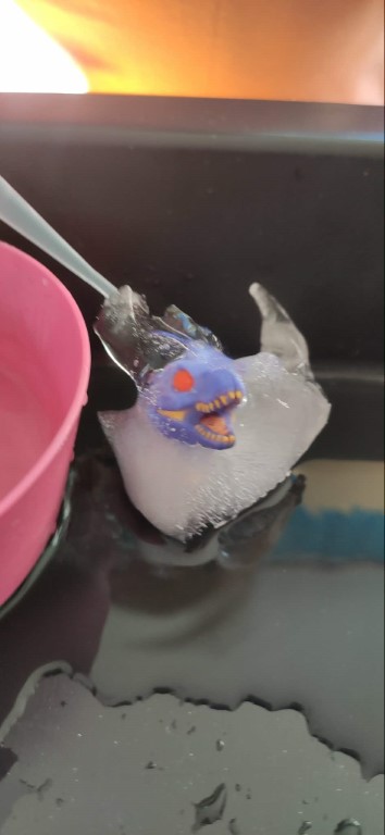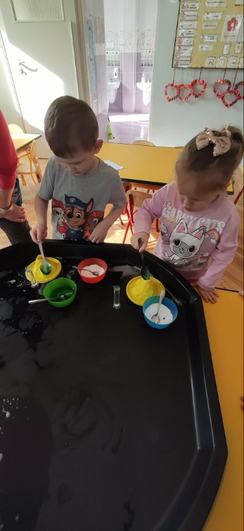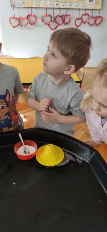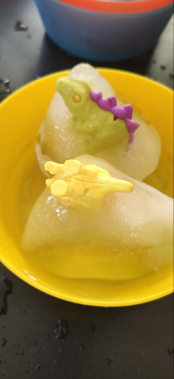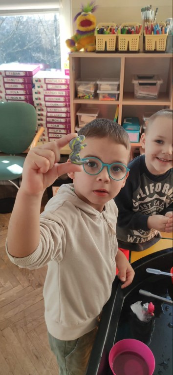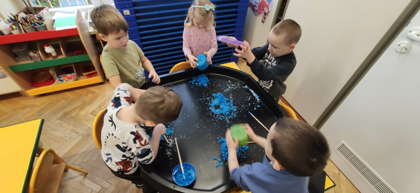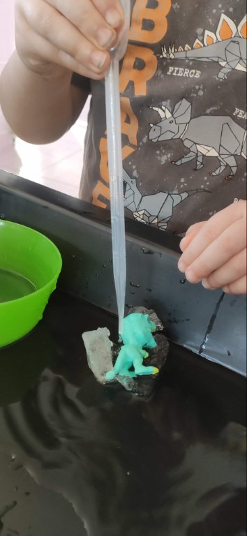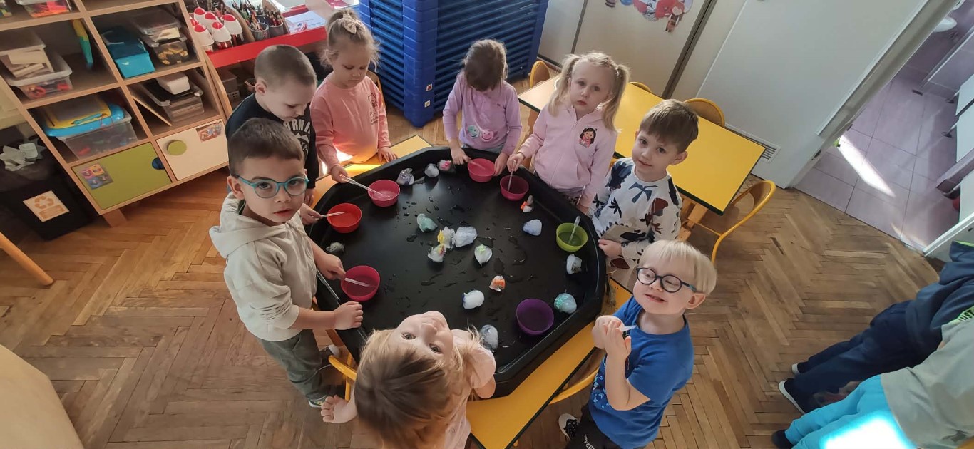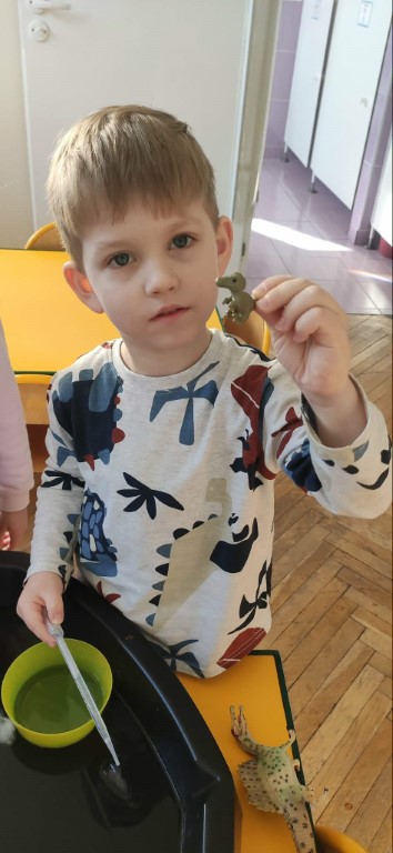 Ogromnym zainteresowaniem cieszyły się zabawy sensoryczne z lodowymi jajami. W środku każdego znajdował się mały dinozaur! Dzieci, używając pipet i ciepłej wody, cierpliwie „wykluwały” swoje znaleziska, ćwicząc przy tym precyzję ruchów i cierpliwość.