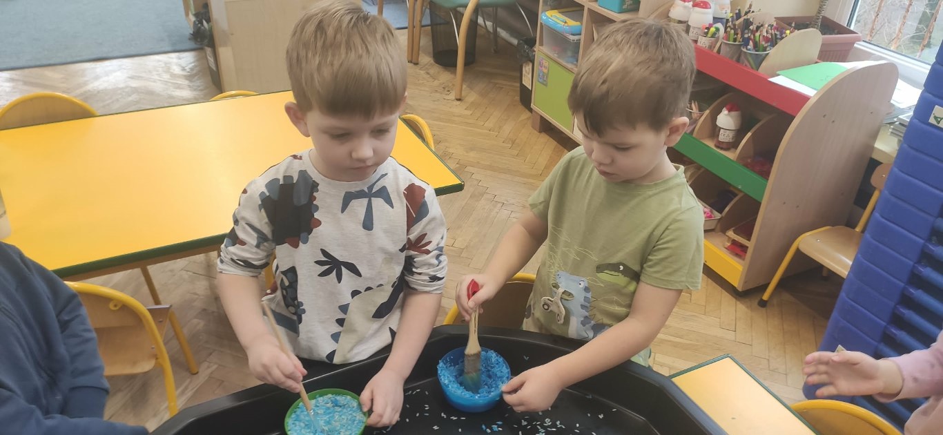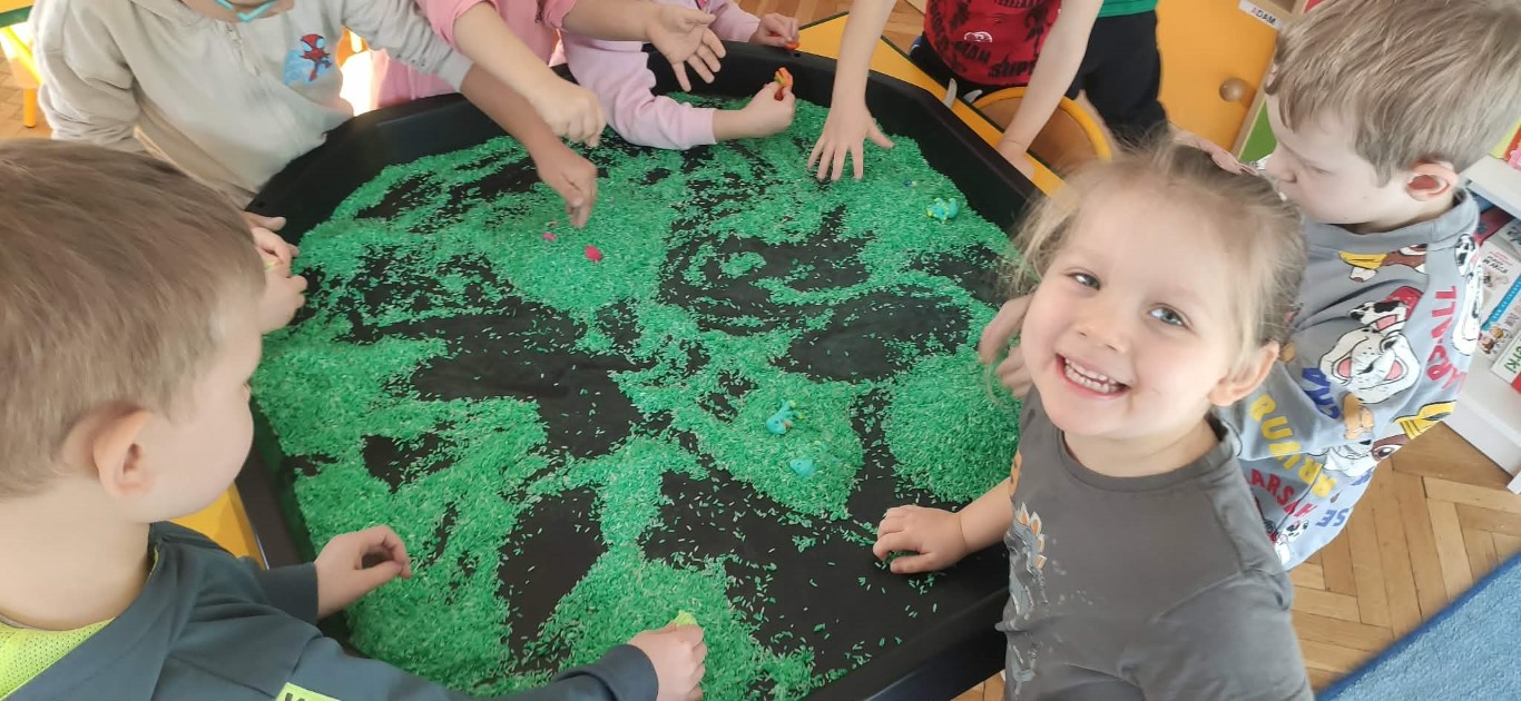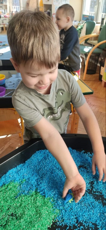 Zabawy sensoryczne – kolorowy ryż- na początek dzieci wzięły udział w kreatywnych zabawach sensorycznych. Malowały ryż, tworząc kolorowe kompozycje inspirowane światem dinozaurów. Było dużo radości, mieszania barw i rozwijania małej motoryki.