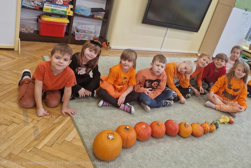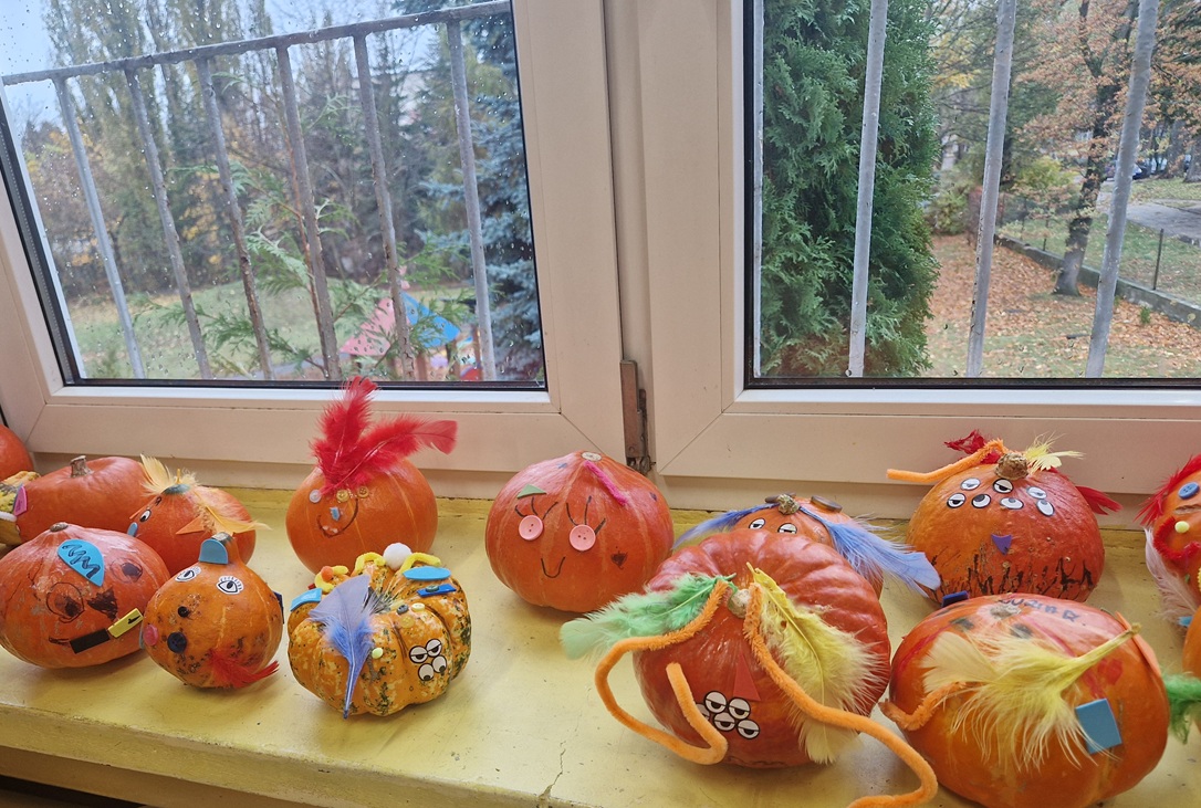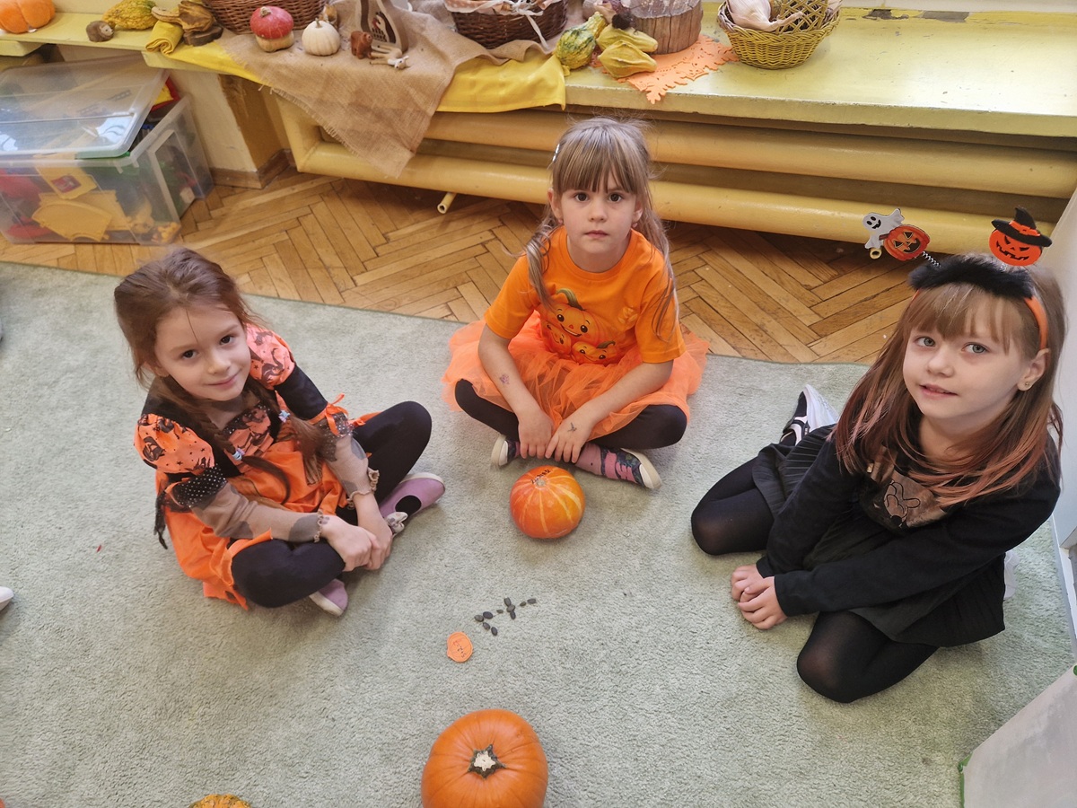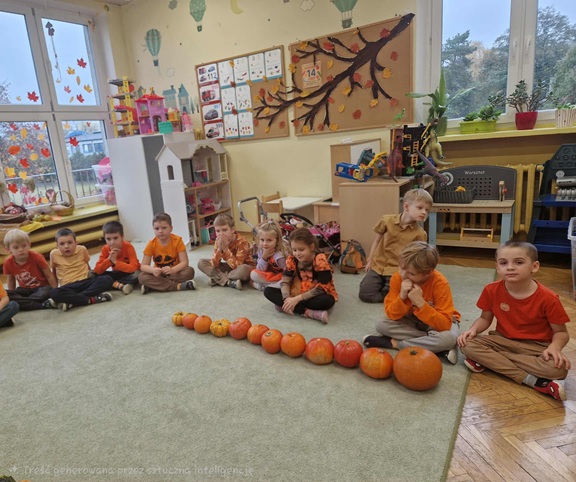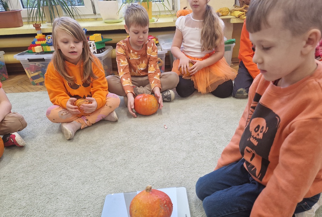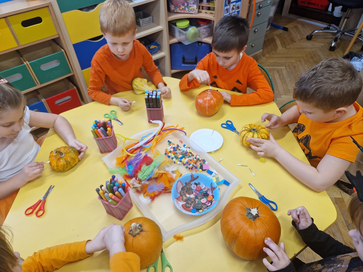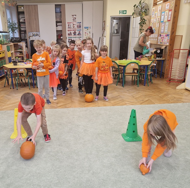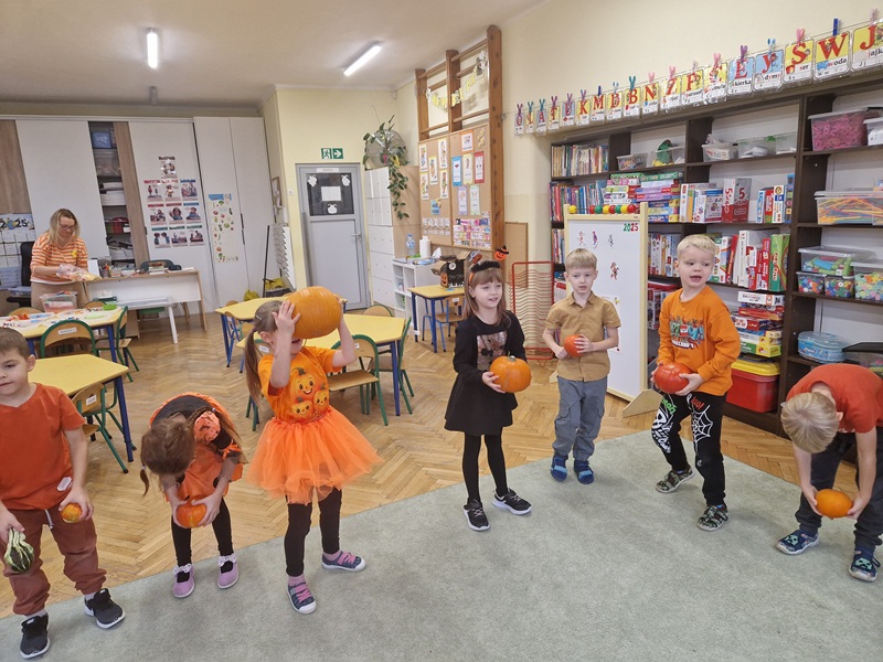 Podczas zajęć nie zabrakło ruchu i dobrej zabawy – była gimnastyka z dynią oraz zabawy ruchowe z elementem rywalizacji. Dzieci z wielkim zaangażowaniem uczestniczyły także w zabawach matematycznych: dodawały, odejmowały, przeliczały i ważyły dynie, a także układały je od największej do najmniejszej. Na koniec nasze dynie zmieniły się w dyniowe stworki i otrzymały oryginalne imiona. Zwieńczeniem dnia był kolorowy i pełen tańców Bal Dyniowy, podczas którego wszyscy świetnie się bawili w rytmie jesiennych melodii.