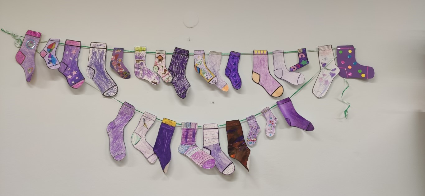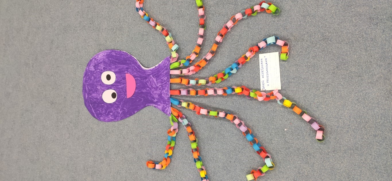 W ramach zajęć wykonaliśmy też prace plastyczne - ośmiorniczki oraz skarpetki, gdzie jedna skarpetka na dziesięć była mniejsza i fioletowa, symbolizując wcześniaka.