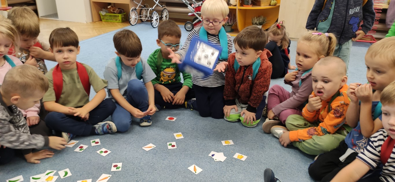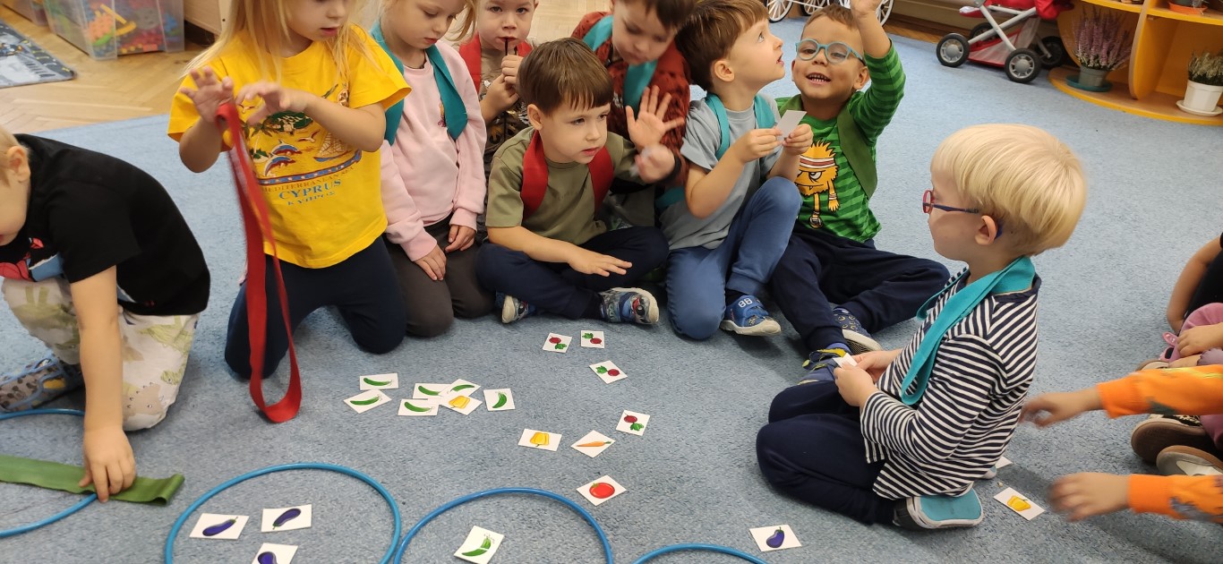 Podczas zajęć dzieci uczestniczyły w zabawach matematycznych rozwijających umiejętność liczenia, logicznego myślenia oraz współpracy w grupie. Tematem przewodnim były warzywa z grządki.