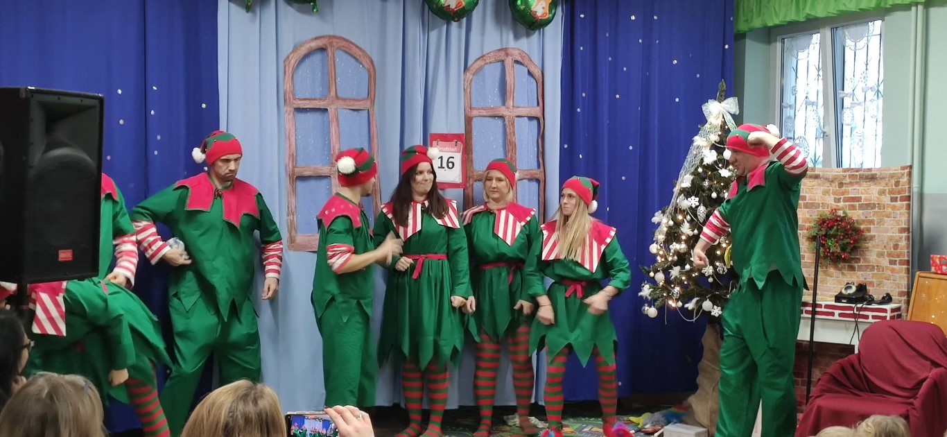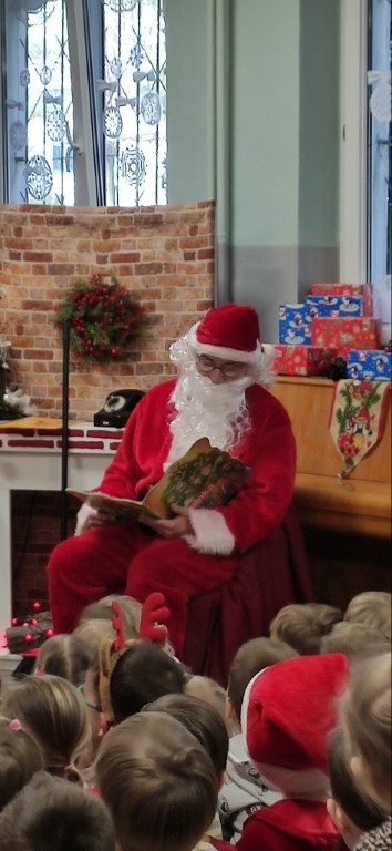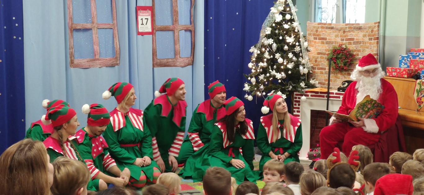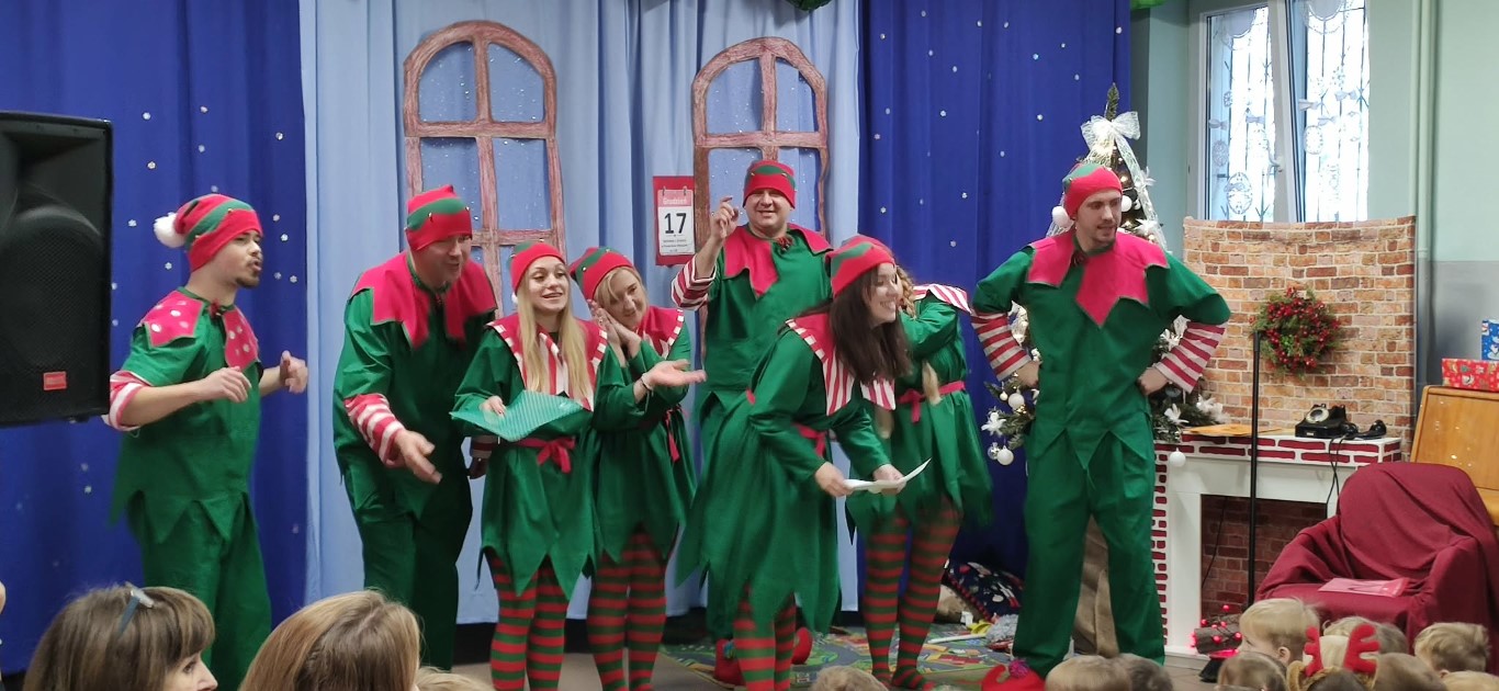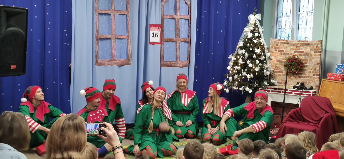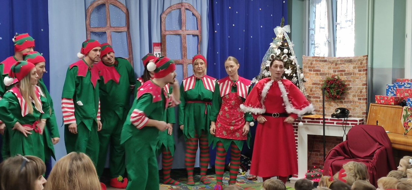 Dziś w naszym przedszkolu odbyło się magiczne spotkanie Elfów i Świętego Mikołaja. Rodzice przedszkolaków wcielili się w role wesołych elfów, które – skuszone pysznymi ciasteczkami – zapomniały o ważnej zasadzie, że najpierw obowiązki, a dopiero potem przyjemności. Z tego powodu elfy musiały wykonać różne zadania, aby naprawić swój błąd i udowodnić, że potrafią wziąć odpowiedzialność za swoje czyny. Podczas przedstawienia dzieci z zapartym tchem śledziły losy bohaterów, kibicując im w wykonywaniu kolejnych wyzwań. Historia niosła ze sobą ważne przesłanie – warto dawać innym drugą szansę, bo każdy może się pomylić. Elfy przekonały się również, jak ważne jest wsparcie i pomoc przyjaciół, bo razem łatwiej pokonać trudności. Spotkanie z Mikołajem pełne było radości, śmiechu i ciepła, a całe przedstawienie dostarczyło dzieciom wielu emocji oraz pięknej, świątecznej atmosfery. Serdecznie dziękujemy wszystkim Rodzicom za zaangażowanie, kreatywność i wspólnie stworzoną magię, która na długo pozostanie w pamięci naszych Przedszkolaków. Po przedstawieniu dzieci otrzymały od piernikowego ludzika - pyszne pierniczki, a Mikołaj z całą brygadą Elfów wręczył dzieciom piękne prezenty.