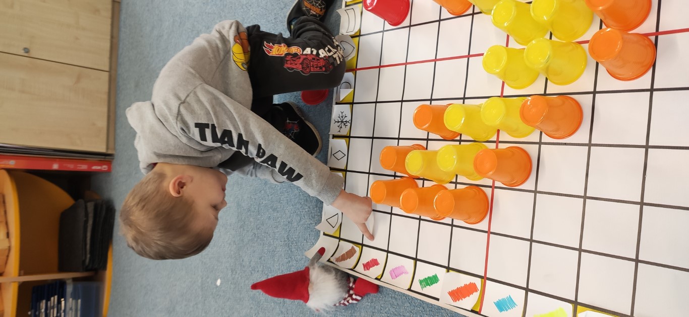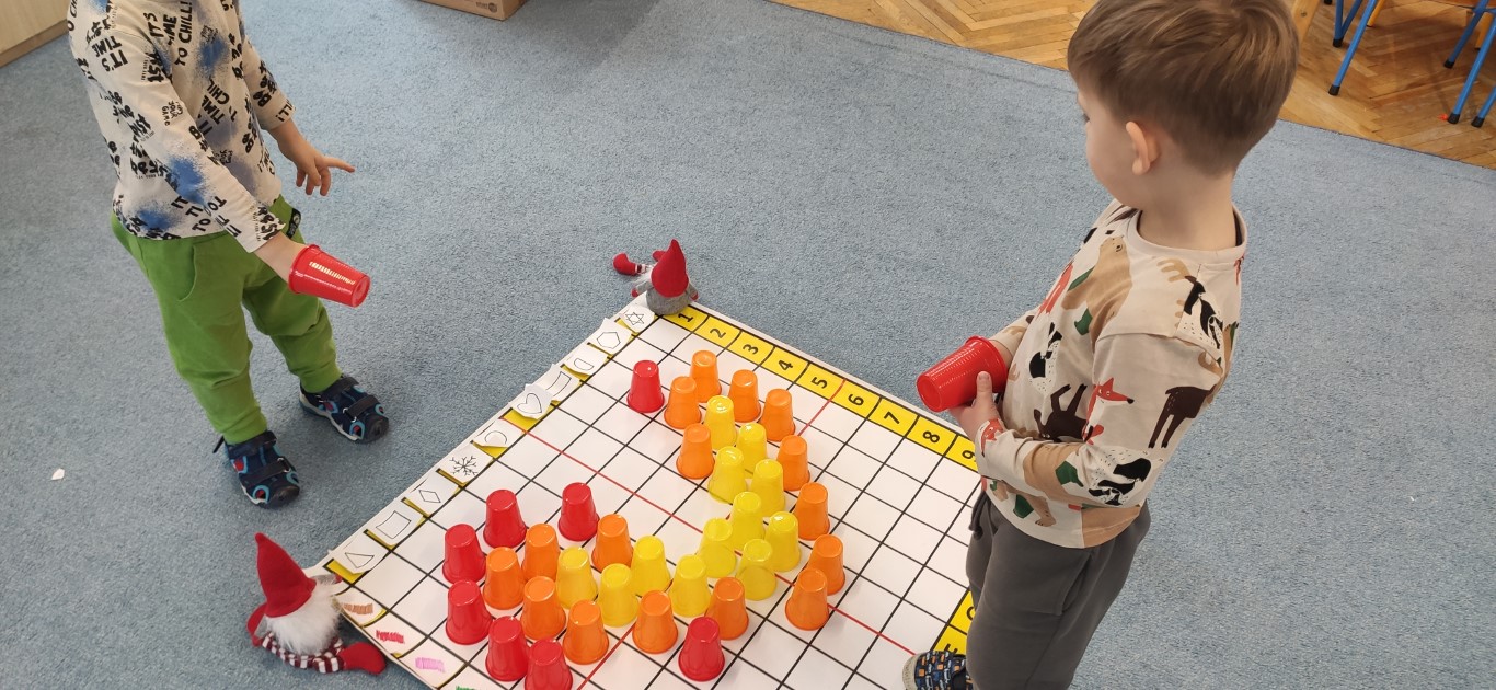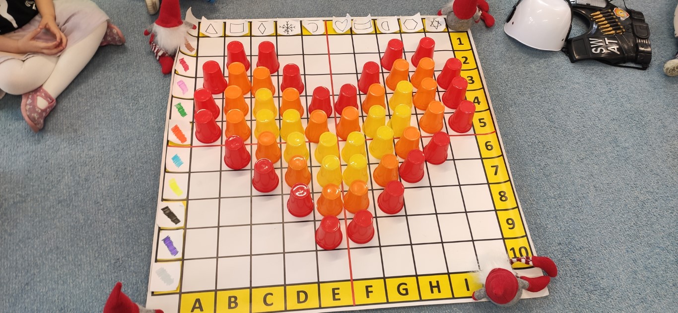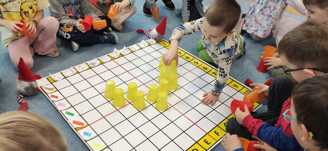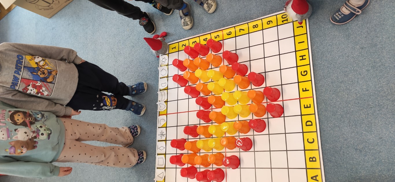 Podczas zajęć dzieci tworzyły „zakodowane serduszko” przy użyciu maty do kodowania oraz kolorowych kubeczków. Zadaniem przedszkolaków było odczytanie instrukcji i odpowiednie ułożenie kubeczków według podanego kodu, tak aby powstał kształt serca. Zabawa rozwijała logiczne myślenie, orientację przestrzenną oraz umiejętność pracy według instrukcji. Dzieci ćwiczyły także współpracę i koncentrację, a przy tym świetnie się bawiły. To była doskonała okazja do połączenia nauki kodowania z walentynkowym klimatem.